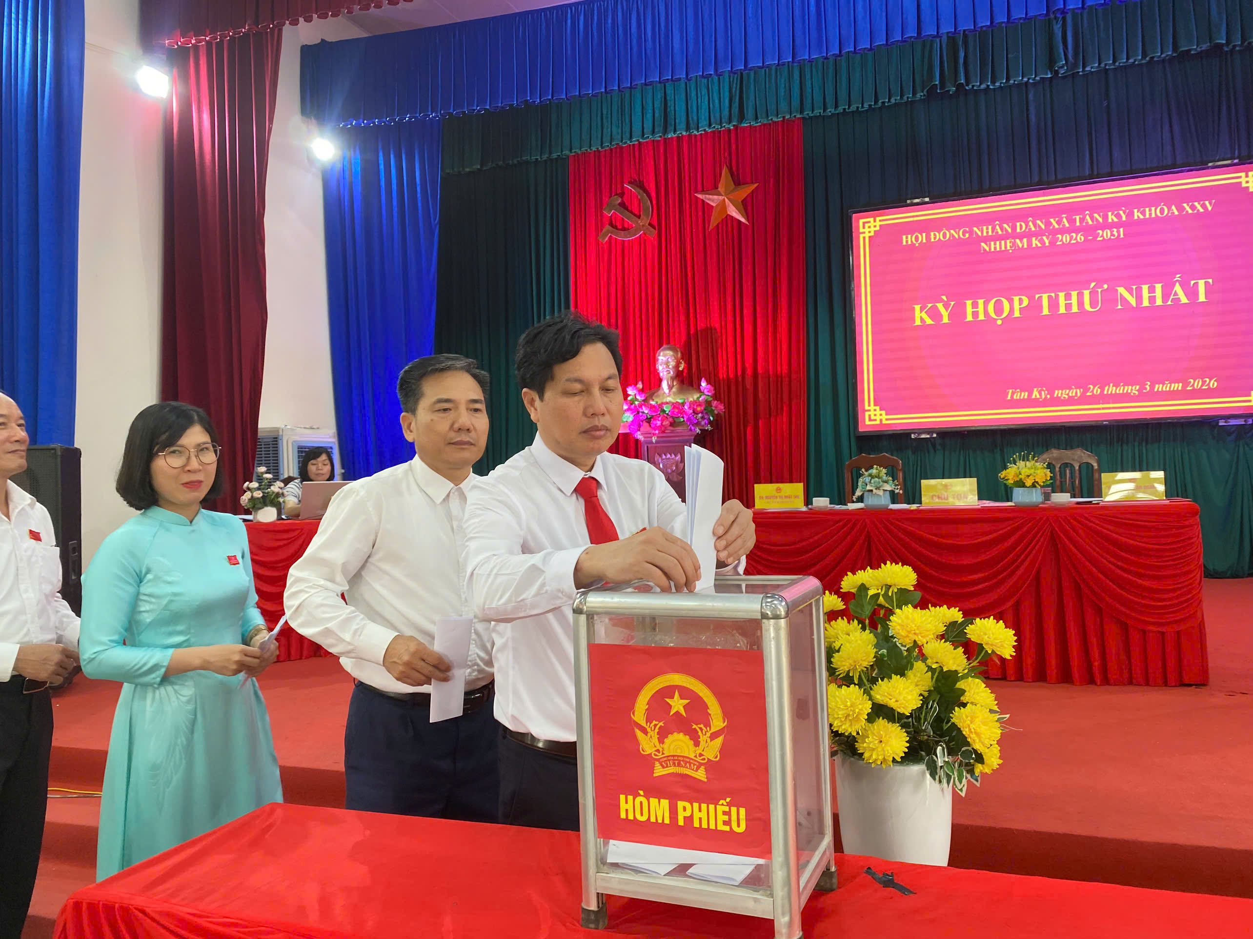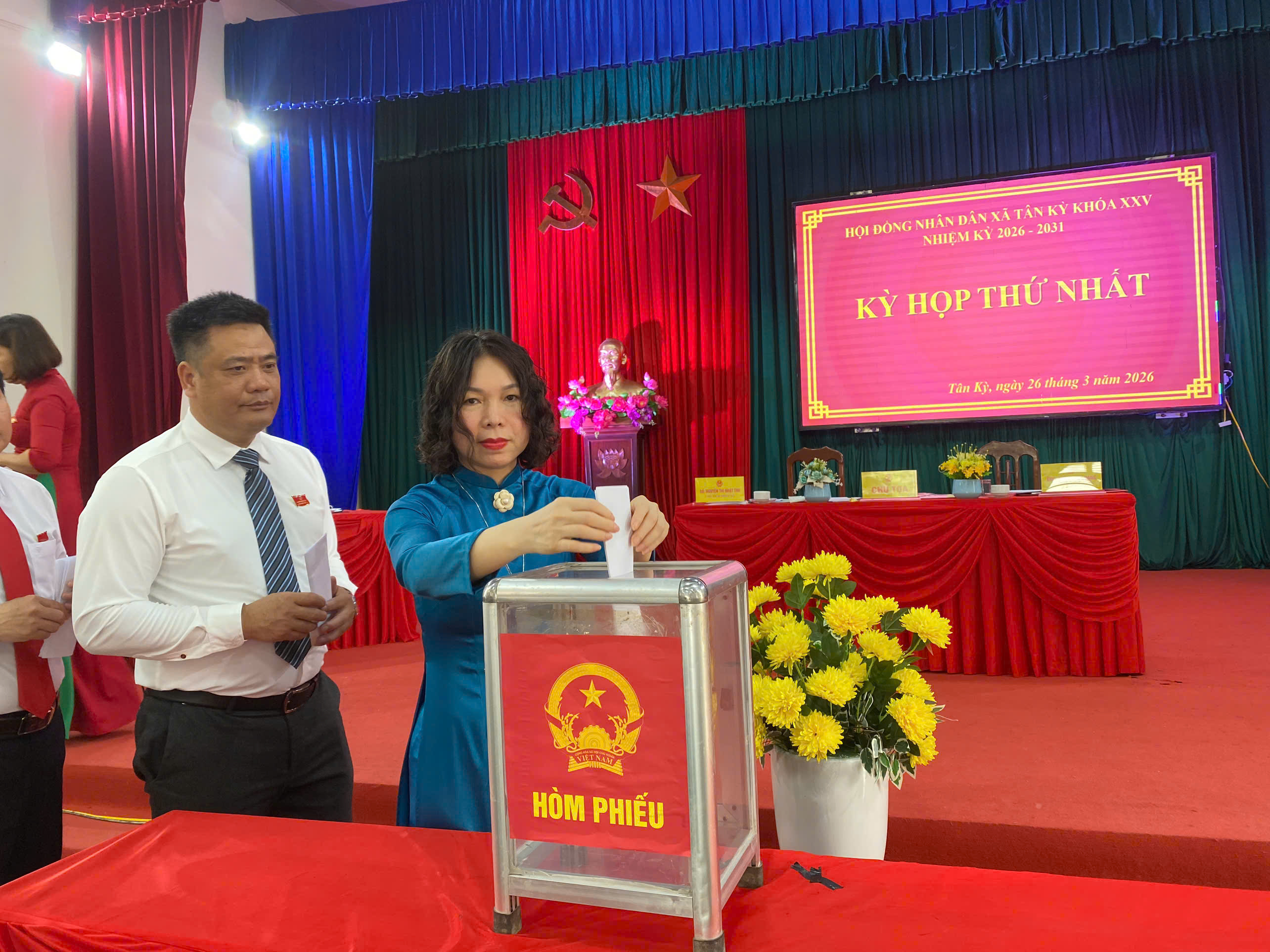 Với tinh thần đoàn kết, thống nhất cao, các đại biểu đã tiến hành bầu các chức danh chủ chốt của HĐND và UBND xã nhiệm kỳ 2026–2031 đảm bảo đúng quy trình, dân chủ, công khai, đúng quy định của pháp luật. Kết quả, đồng chí Nguyễn Thị Nhật Thu được bầu giữ chức Chủ tịch HĐND xã; đồng chí Phan Văn Quang giữ chức Phó Chủ tịch HĐND xã. Đồng chí Vũ Thị Hoa được bầu làm Trưởng Ban Kinh tế - Ngân sách; đồng chí Đặng Thị Nhu giữ chức Trưởng Ban Văn hóa - Xã hội HĐND xã.