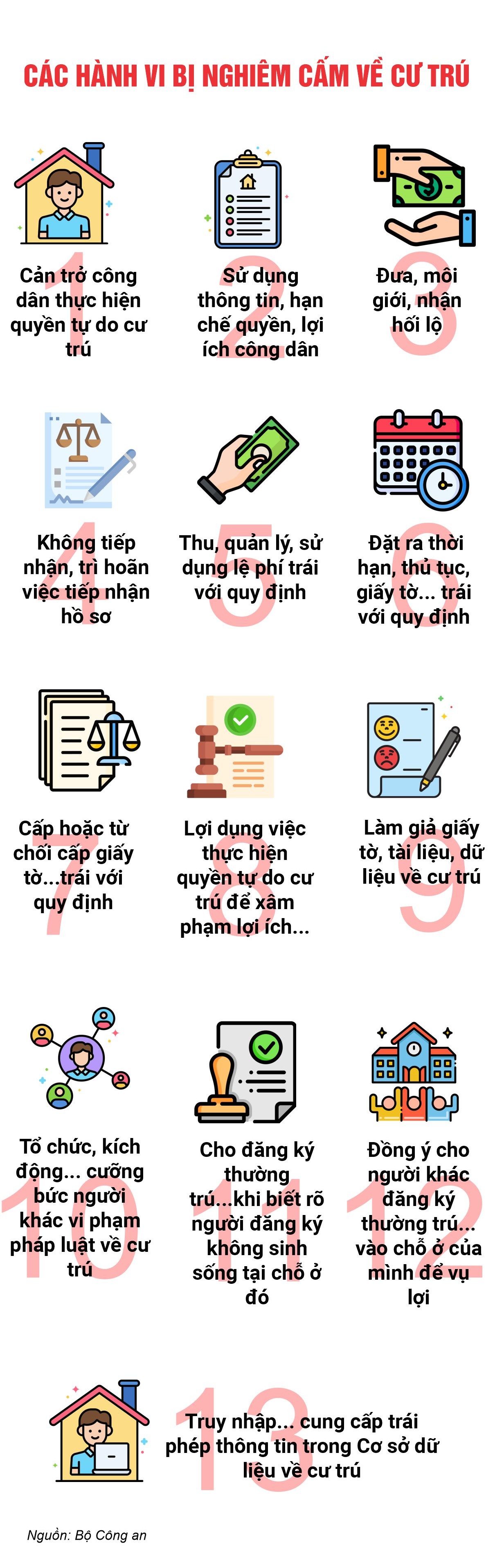 Theo quy định tại Điều 7 Luật Cư trú năm 2020, có 13 nhóm hành vi bị nghiêm cấm về cư trú. Cụ thể như sau: